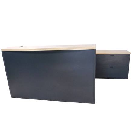We have for sale a reception desk and a lateral filing cabinet set. The set is in used condition with scratches and scuffs from normal use, but nothing that affects their overall functionality.