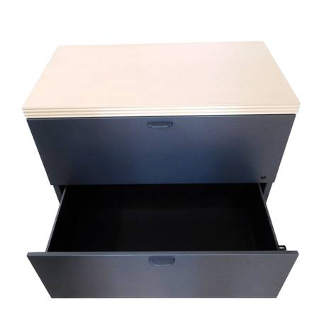 The 2-drawer lateral filing cabinet features a lock, but no key is included. The drawers on both the reception desk and filing cabinet slide out smoothly. The filing cabinet measures 35-1/2" L x 20-1/2" D x 29-1/4" H, with inner drawer dimensions of 31-1/2" L x 15" D.