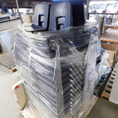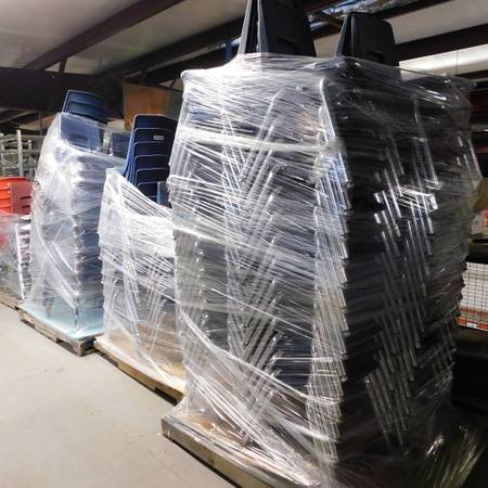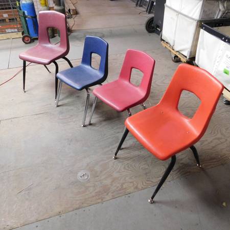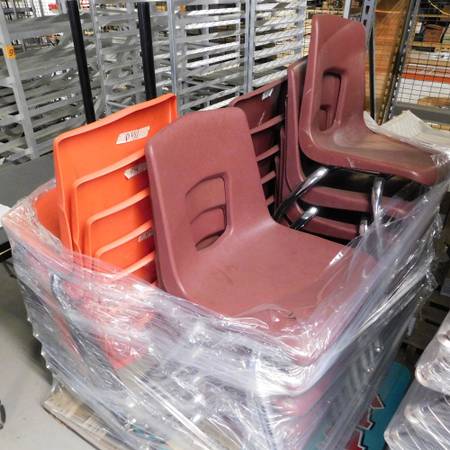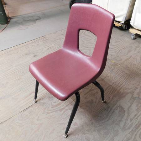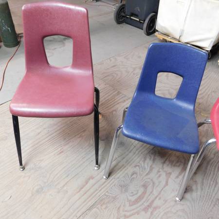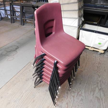 We have a large quantity of stacking school chairs for elementary and middle school children. There are two different sizes in various colors including navy blue, burgundy, black, and orange.