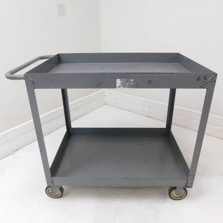 Uline Welded Steel Rolling Cart for sale. The cart measures 36" Long x 24" Wide. The lip around the top and bottom shelves measures 3 inches high. The wheels roll smoothly.