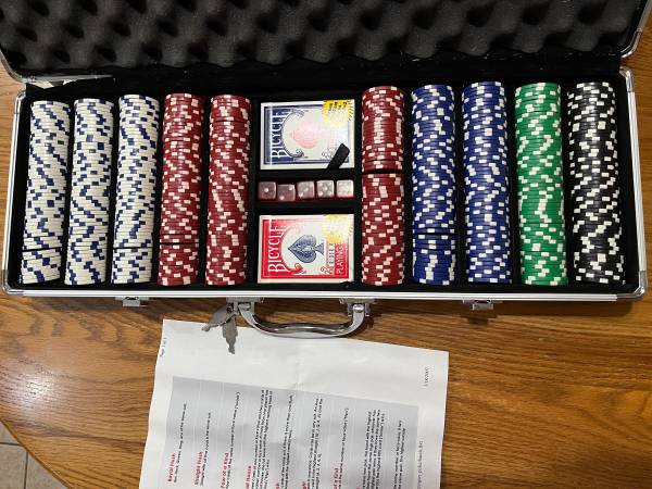 Poker Chip Set in Locking Aluminim Case. Comes with keys, 500 poker chips, 5 dice, and 2 decks of cards. In very good condition.