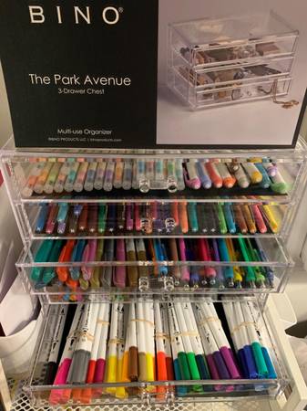 Set of 3 high-quality Bino acrylic drawer organizers for sale. Perfect for storing pens, markers, makeup, jewelry, crafts, stationery, office supplies, art materials, beauty accessories, or small electronics. Great for home office organization, desk storage, classroom supply, vanity tray, bathroom counter, or closet shelf.