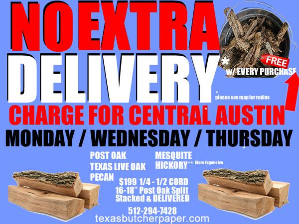 FREE DELIVERIES (or rather NO additional delivery charges) w/i 5 miles from the Texas State Capitol in Central Austin, parts of S. Austin, & SW. Austin on the following days only for 1/4 - 1/2 Cords of FIREWOOD:
