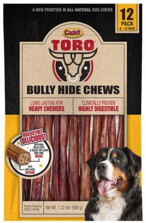 • A 12 count bag of Cadet Toro Bully Hide Chews for health, and…