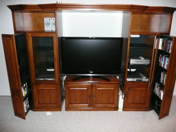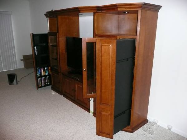 Five piece touch light entertainment center with pull out tape/DVD storage cabinets and adjustable shelves.