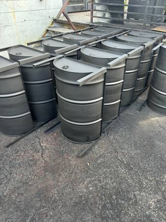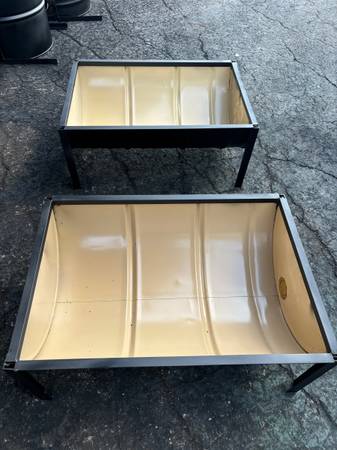 Metal half barrel fire boxes with welded frames perfect for burning perfect water troughs $65 each.