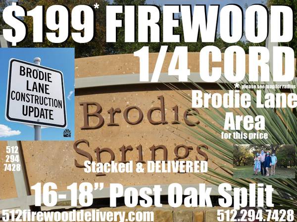 Firewood Delivered Stacked or Wood Yard Pick Special - BRODIE HEIGHTS !!! Or on Brodie Lane or near it in S. Austin or SW. Austin, Brodie Springs, Shady Hollow, Whispering Oaks, ABC Streets, etc....