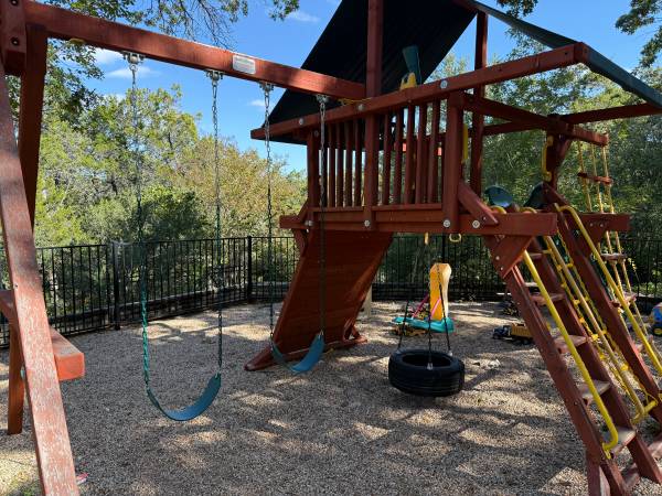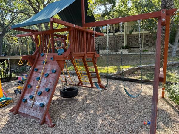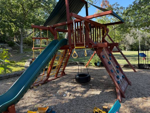 Tree Frog Jaguar playset - only four years old and $4K plus brand new. My kids have loved this and still continue to play on it, but we’re moving and don’t have room for it. Has normal wear from being played on, but it’s in very good condition with no rot and no structural issues. Includes two regular swings, rock, climbing wall, tire, swing, telescope and wheel, rings, rope ladder, two regular ladders, and slide. I have an extra toddler bucket swing I can throw in. You must bring tools to disassemble and transport – this is a two person job and I am unable to assist. Pick up is near 360 and Bee Caves Road.
