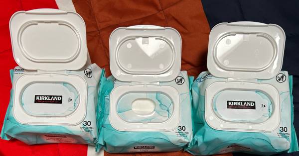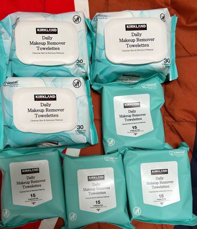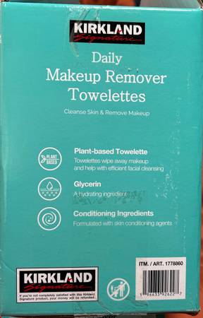 Here we have a box of Costco’s Kirkland Signature Daily Makeup Remover Towelettes, 120+ count. This appears to be a customer return; originally 180 premoistened towelettes, this Box includes: