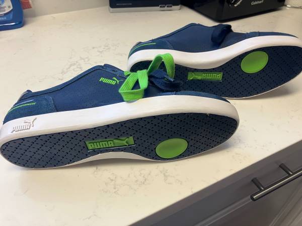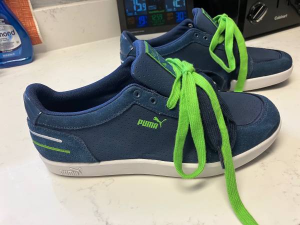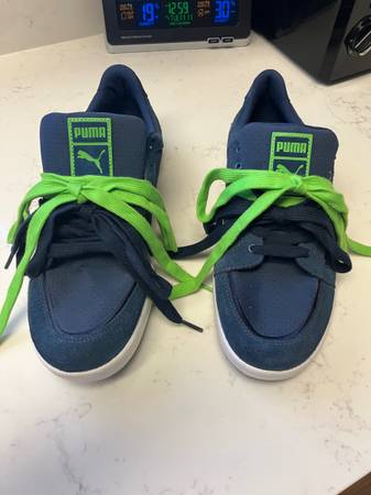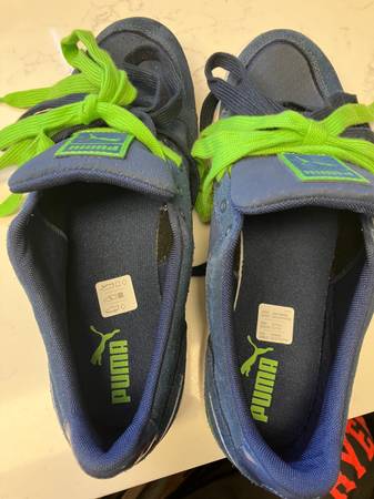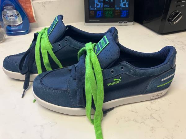 Blue Puma sneakers with blue or green laces. Very little wear, like new.