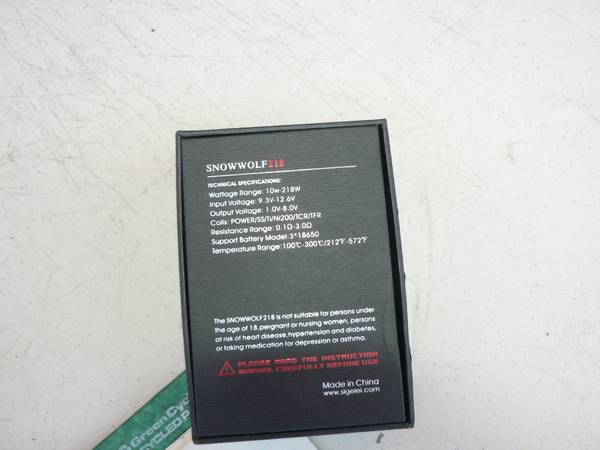 The Sigelei SnowWolf 218 was made in collaboration with Sigelei and GlobalVaping. The Sigelei SnowWolf 218 features a one of a kind stabilized wood front panel design for a beautiful and unique finish. The stabilized wood is 100% made in the USA by GlobalVaping. The Sigelei SnowWolf 218 requires (3) High Amp 18650 batteries (Sold Separately) for a long lasting vaping experience. The Sigelei SnowWolf 218 can fire up to 218 watts and is perfect for the cloud chasing enthusiast. The Sigelei SnowWolf 218 features temperature control modes supporting Nickel 200 (Ni200), Titanium (Ti), and Stainless Steel 304,316,317 (SS) coils. The Sigelei SnowWolf 218 also features the Temperature Coefficient of Resistance (TCR) and Temperature Factor of Resistivity (TFR) mode as well.