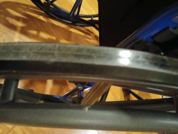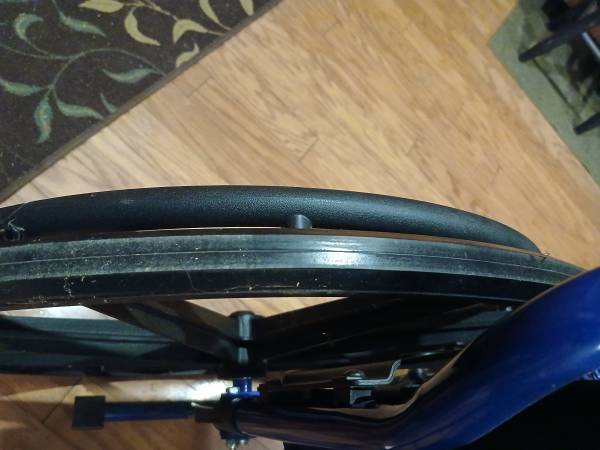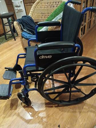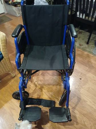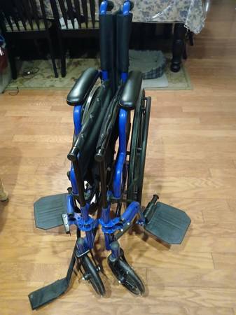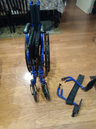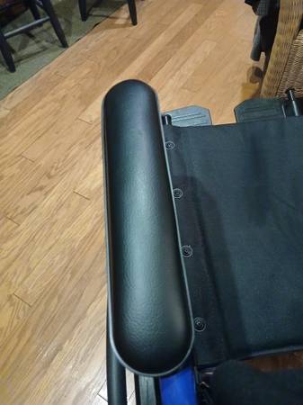 brand new Wheelchair pics of arm rests and of the tires included to show its new . foot rests detach and chair folds up for easy travel or storage. an excellent wheelchair top quality. asking $90