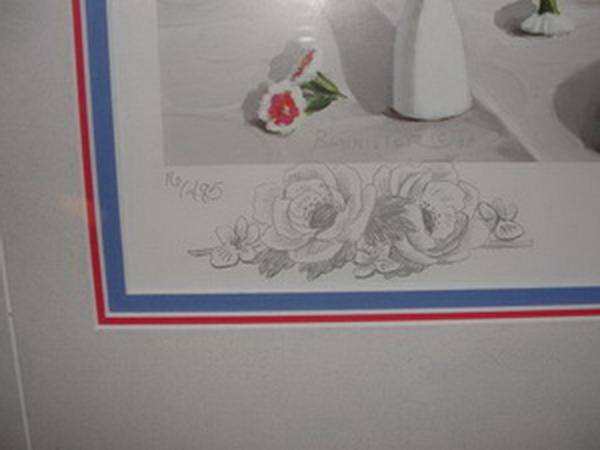 A "remarque" is an original drawing by the artist that reflects on something pertaining to the print subject. On Pati Bannister prints, it is done at the bottom left hand corner on the white border next to the number of the print. For instance, with this print, it is flowers. It is very unique and certainly one-of-a-kind. It also increases the value of the print.