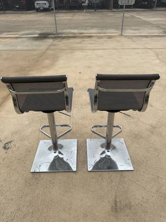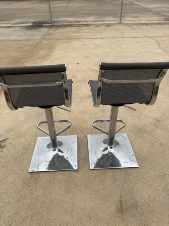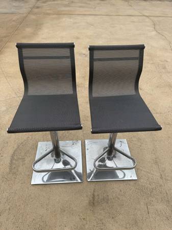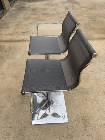Nice gently used light gray pair of bar stools or sit up table stools. The material is mesh nylon and the body if chrome. Cash only please.
