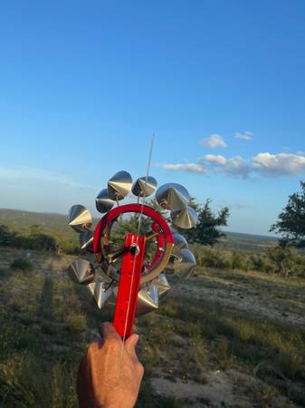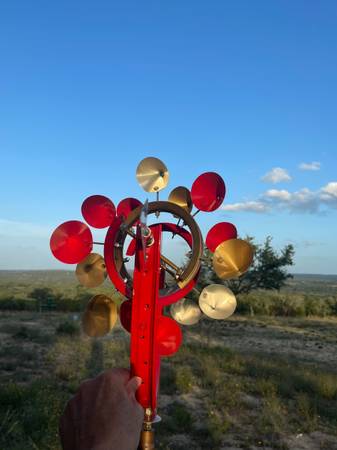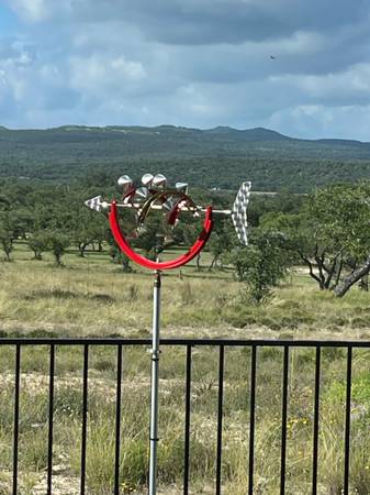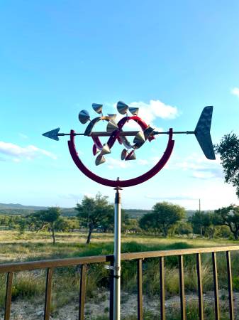 This is a very unique custom made weather vane & wind spinner! There are 14 conical wind cups in colors red, gold, and silver. The weather vane swivels and points in the direction of the wind. Reply via CL email link if you want to see a video of the wind spinner in action.