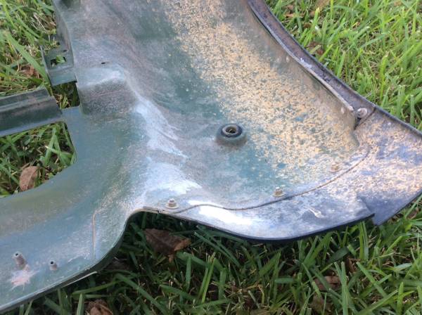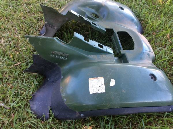 This is the fender off of a Kawasaki Prairie 650 atv. The green fender is in good condition with some scratches and scraps. The black plastic trim pieces are cracked in a few places. No emails...