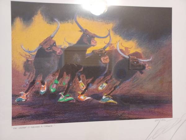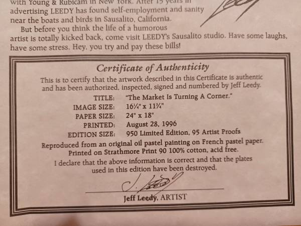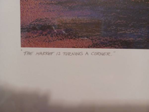 "The Market is Turning." Framed numbered print by witty artist Jeff Leedy. A certificate of authenticity is included on the back.