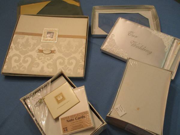 TWO WEDDING BOOKS---SCRAPBOOK AND SIGNATURE BOOK AND TWO BOXES OF HEAVY PAPER INVITATION CARDS. ONE IS A PARTIAL BOX. CASH ONLY; NO SHIPPING. WE HAVE MORE. WWW.CRAZYWAX.COM