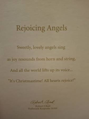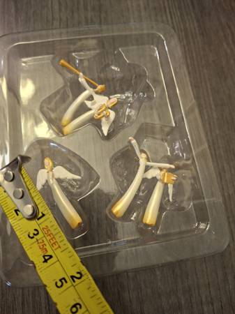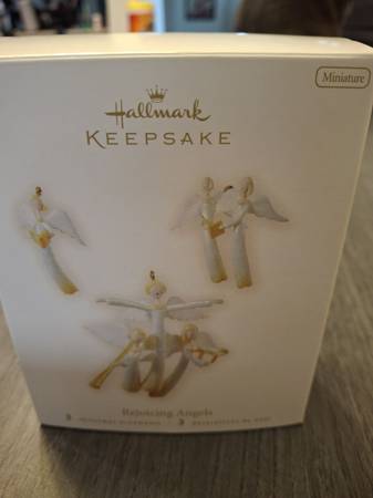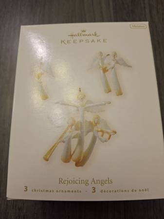 The Hallmark Keepsake Rejoicing Angels Miniature Christmas Ornaments Set of 3 is a beautifully crafted collection for the holiday season. Each ornament features a Holiday Angel Barbie character design, made from resin material in a contemporary style. The set includes three white-colored angels with a hanging feature, artistically designed and handmade to bring joy to any Christmas tree. Perfect for collectors or anyone looking to add a festive touch to their holiday decor, these ornaments are a charming addition to any Christmas tradition.