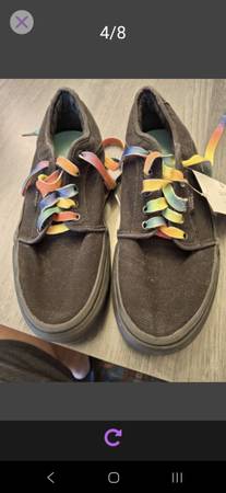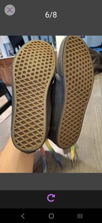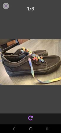 The product is a pair of VANS sneakers in a men's size 8.5 and women's size 10.5, featuring a black color with a rainbow pride theme. The sneakers are part of the VANS Classics collection and are designed in an athletic style. The brand, VANS, is known for its iconic sneakers and this particular pair celebrates the LGBTQ+ community with its rainbow pride design. Perfect for those looking to show their pride in a stylish and comfortable footwear option.