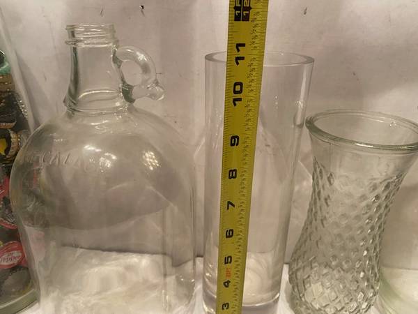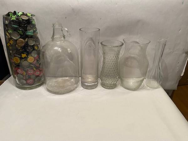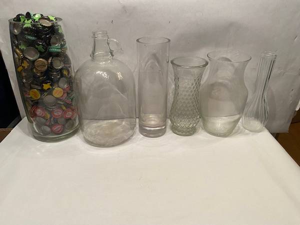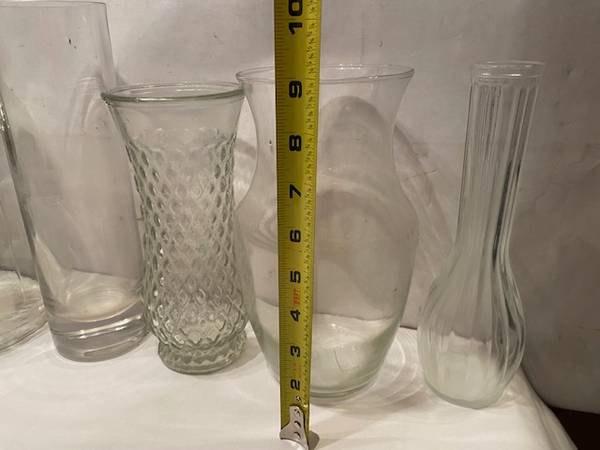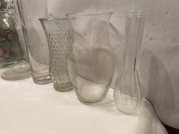 FOR SALE: SIX Clear Glass Vases Fresh Cut Flowers Plants Table Kitchen Patio ALL SIX Vases for $20