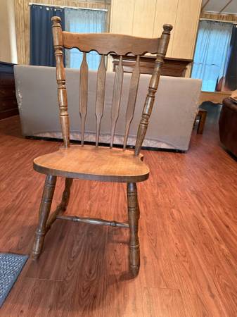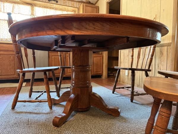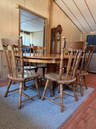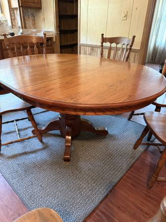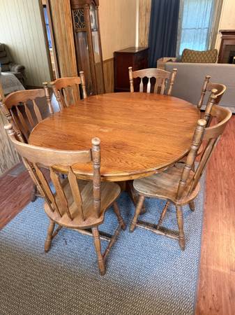 Solid wood dining table in good condition. Six matching chairs. The table has 1 removable center leaf. When the leaf is removed, the table is circular.