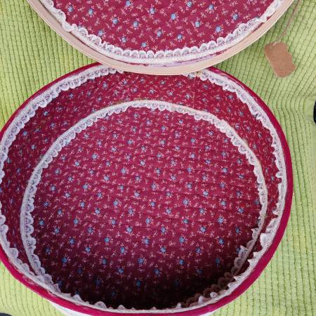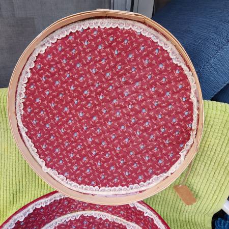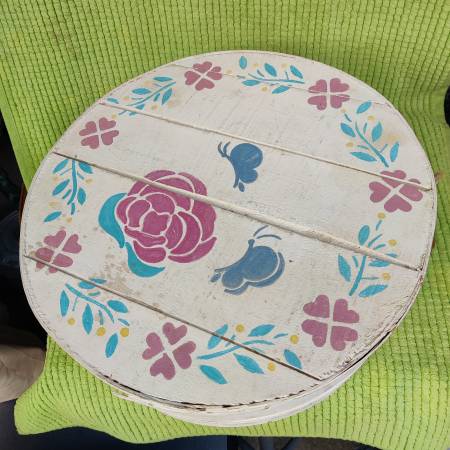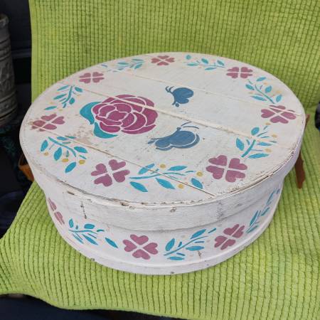 Vintage cheese box is about 16 in in diameter. Would make a great sewing box or craft box etc.. In great condition! Has foam floral cloth liner and lace inside. Please call or text only emails will...
