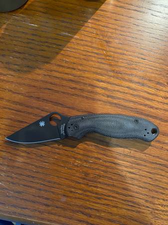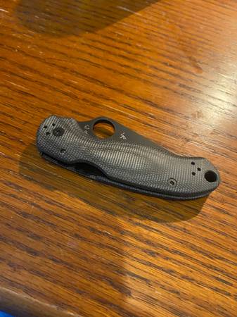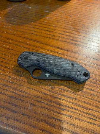 Factory edge spyderco para3 with after market grey micarta scales. No pocket clip but condition is practically new, never used the edge either.