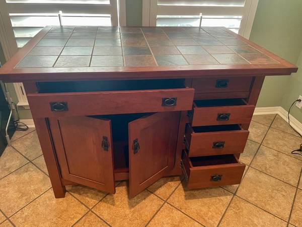 Amish Kitchen Island: Top 31" x 54.75", Base 34" x 48" x 24.5". Five drawers and two-shelf cabinet. Top consists of multi-colored slate tiles. Excellent condition. Top extends over base by 8".