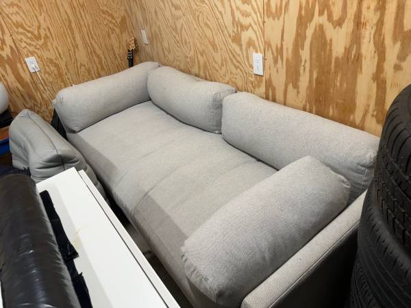 99" x 90" x 40" gray fabric Sunday sofa by Blu Dot. L-shape, with the shorter side on the right. in great condition with all fabric covers removable for washing, except for one corner that my very bad puppy Atlas (pictured, not for sale) chewed. corner is repairable with the same fabric, or in a cute patchwork style, or can have a blanket draped over it to hide it. also willing to sell the 90" sofa separately.