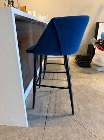 Set of 2 blue velvet bar height stools with black metal legs and footrests. Modern design with curved backs that are comfortable and supportive. These look great at a kitchen island or bar counter.