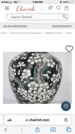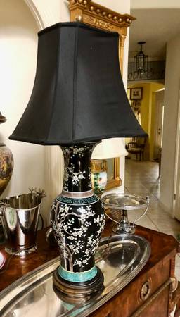 exquisite 1970 vintage 36” TALL Qing Famille Porcelain vase converted to lamp. Striking Black silk shade but also have original white pleated shade - your choice. Beautiful colors and design for just that right splash of Chinoiserie. See listing for vase alone at $2100