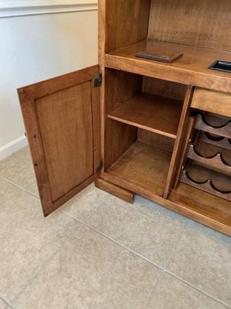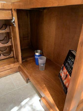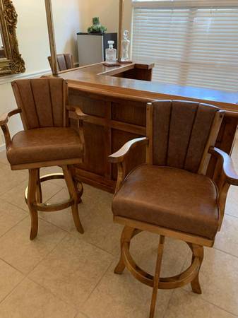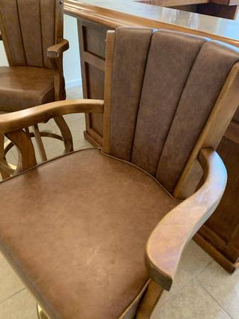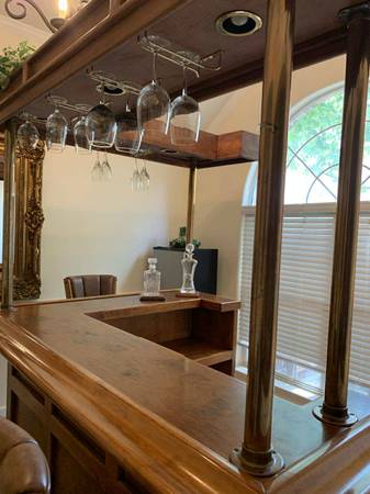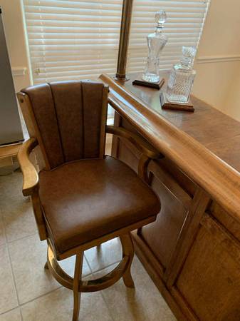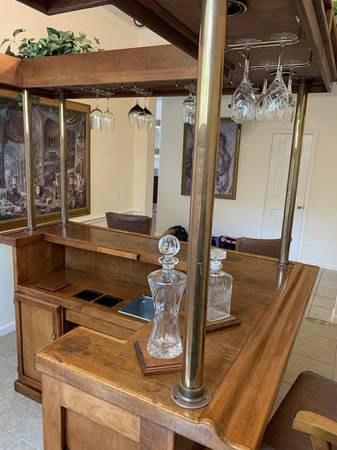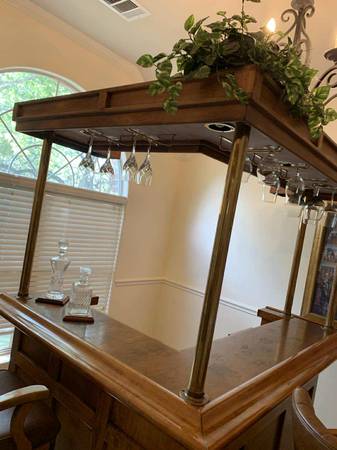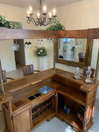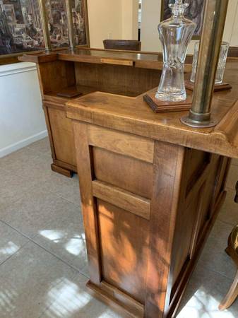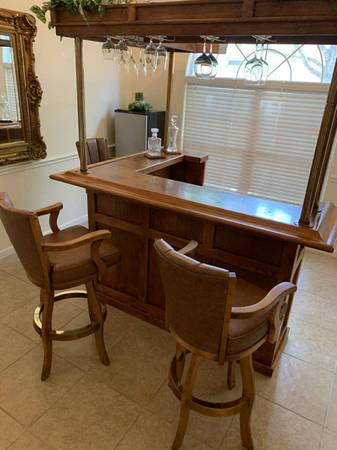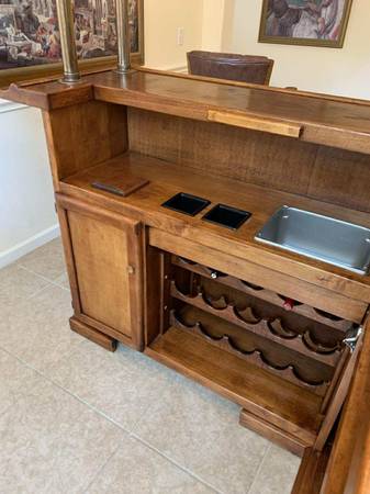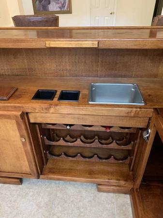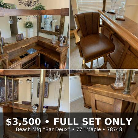 Turn a room into a lounge. Selling the complete set only: solid maple 77β Beach Manufacturing βBar Deuxβ with canopy + 3 matching leather/maple stools. One owner; beautiful condition with light, normal wear. Highlights include the canopy with brass poles, hanging stemware racks, a two-tier top with a drink rail, a mini prep sink, drop-in bins, awine rack, and generous storage.