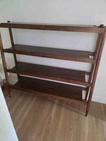 Paid over 3K new. Solid wood walnut shelves would be a great room divider, or just a beautiful place to display art or books. This is a substantial quality piece. Depth is about 16 at bottom and 12 at top. Floor to top shelf is 56 inches. Width at bottom 61 and change and at top 57ish.