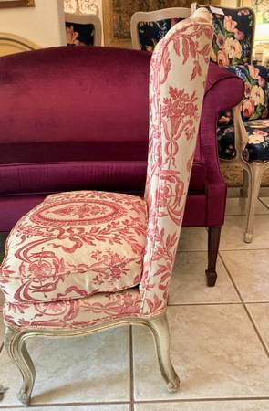 $350 Divine antique chair - The essence of femininity. Singularly lovely antique French chair with plump down cushion and exquisitely patterned fabric with floral urns. This is a beautiful companion to the pictured Loveseat, which has a very complementary coloration.
