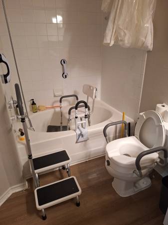 2 step stool with handle $40, height adjustable bathtub handle $30, 2 suction grab bars (2) $20, Shower chair with arms $40, 5" raised toilet seat with handles $30 (sanitized). $150 for all.
