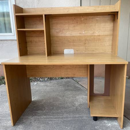 Sturdy oak-finish computer desk with upper hutch shelving. Great for home office, student desk, or a compact workspace. Includes multiple shelves, a built-in raised platform for a PC tower or printer, and a cable-management cutout.