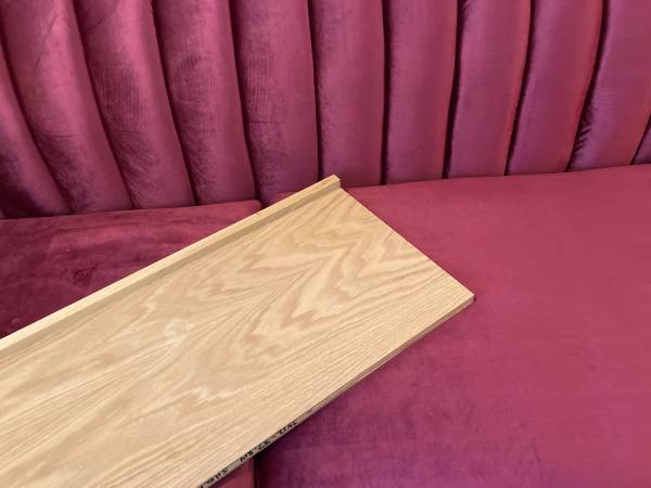 Pre-finished oak shelves for a closet. 3/4" plywood with finished oak veneer on both sides. 3 edges are unfinished, the fourth has a 1.5"x1.5" square oak board facing glued to it. All in new condition. Light oak color.