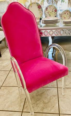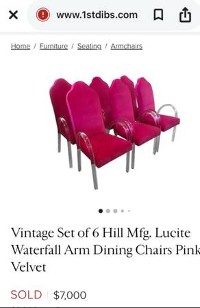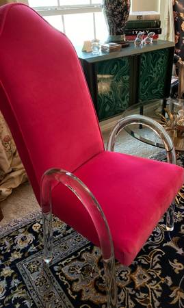 Striking PAIR hot pink velvet vintage waterfall chairs with lucite arms and legs - only mild signs of use. Rear height is 43 inches; width is 22; depth is 18 and seat height is 17 1/2 inches. Please...
