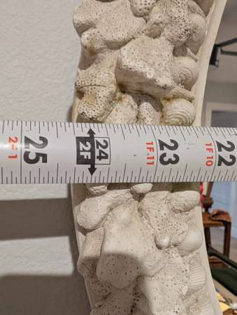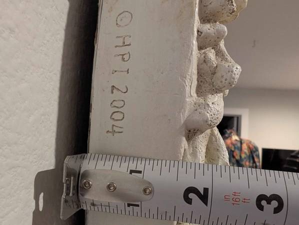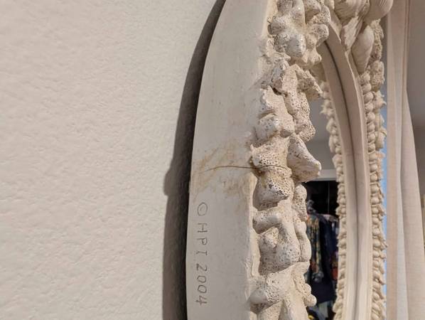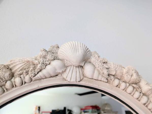 Gorgeous seashell hanging mirror by House Parts, Inc. Sturdy and quite heavy, perfect for any room and would look especially amazing in a powder room over a vanity. Overall good condition but please see photos for a tiny crack that has been reinforced. The crack is barely noticeable and bears no structural damage to the mirror. Please see photos for dimensions.