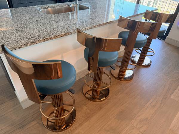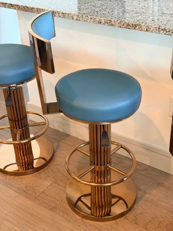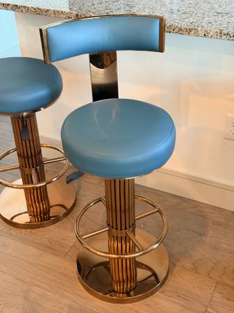 Stainless steel legs, footrest, and comfortable blue cushion. Adjusts for counter or bar height. Overall Size: 15"D x 15"W x 37.4"-41.3"H; Adjustable Seat Height Size: 25.6"-29.5"H; Blue Seat...
