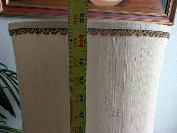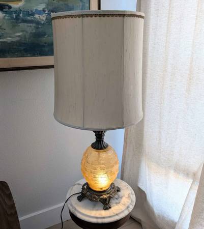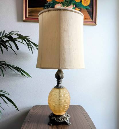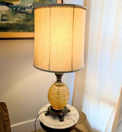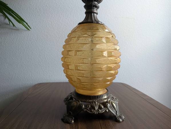 Available. Beautiful vintage amber lamp with Stiffel lamp shade. This lamp has 3 lighting configurations with a new bulb in the base. See photos for details and dimensions.