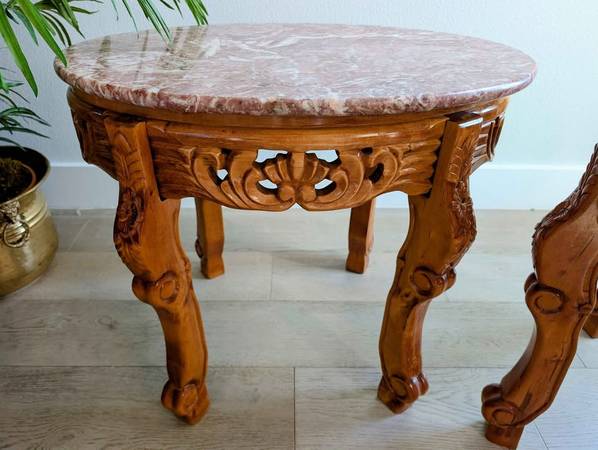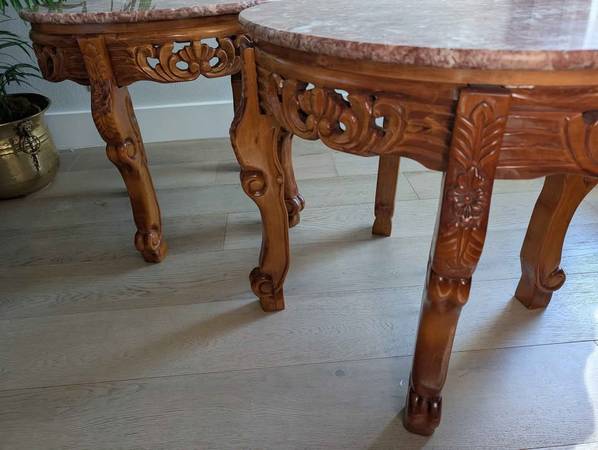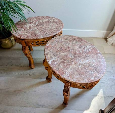 2 available. Price is per table. Stunning carved oval pink marble top occasional aide table. Lovely vintage condition. No maker's mark or signature. Please see photos for dimensions and condition....