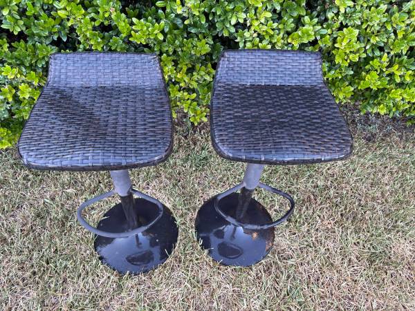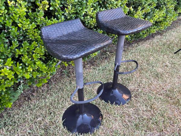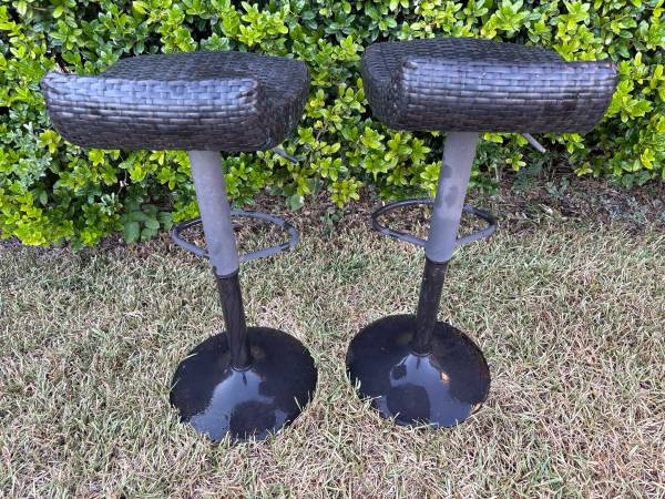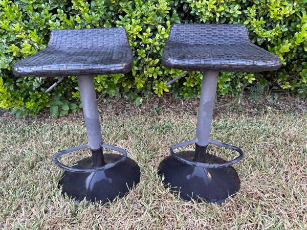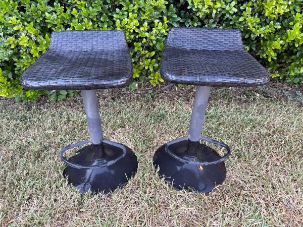 Modern Outdoor Wicker Espresso Metal Frame Swivel Adjustable Height Bar Stools. Price is for both.