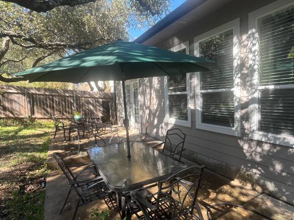 Wrought Iron and Glass Patio Table with 4 Chairs, plus 2 more Chairs and Ottomans in great condition $275 OBO for the entire set. Umbrella in photo $100 Perfect for Texas Fall Weather!