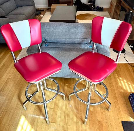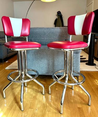 2 retro swiveling bar stools and 1 diner table Bar tool measurements: - Seat Diameter: 15" - Seat Height: 30" - Overall Height: 41" Diner table Measurements: 24" diameter 42" tall
