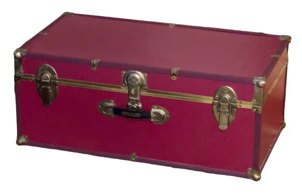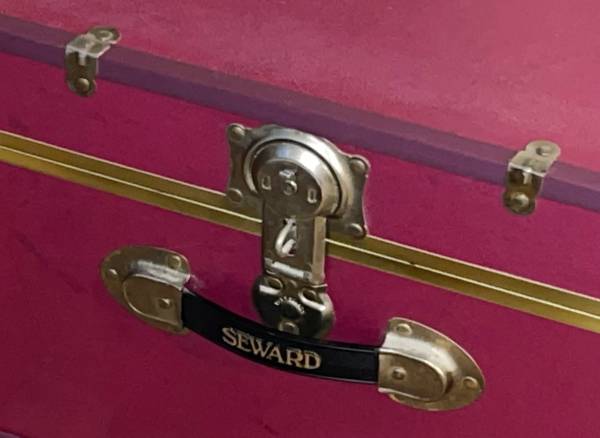 In great shape. Latches in middle and the on the right and left too but does come with the key. Lined with particle board inside.