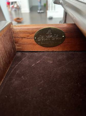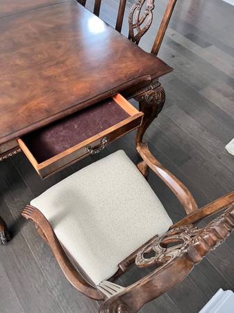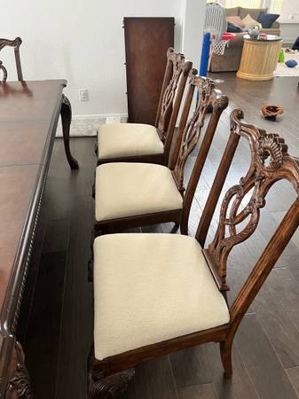 Solid wood dining table (expandable, comes with 2 leaves) and 8 dining room chairs. They are from the Seven Seas Collection by Hooker Furniture. Everything is in great shape, with a few very light scratches/dings on the set but no deep gouges or signs of intense wear. I believe chair seats could be recovered if the cream fabric isn’t your thing. It hasn’t been used much, and we are choosing to convert our formal dining space to be used for a different purpose. Smoke free, pet free home.