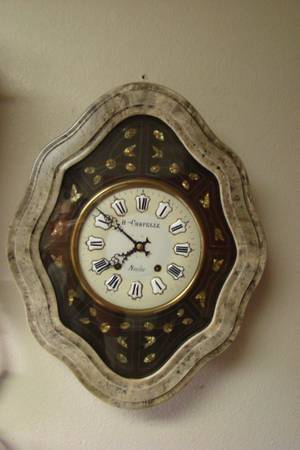 ANTIQUE H.CHAPELLE ( NANTES ) WALL CLOCK MADE IN THE19 C. MOTHER OF PERAL INLAID JUST BEEN CLEANED AND OILED,RUNS LIKE NEW, EXCELLENT CONDITION. 2' TALL 19" WIDE. $200.00