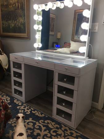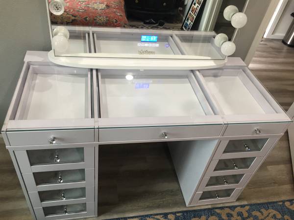 Glass Top, glass front drawers, Diamond Knobs, Bluetooth Speakers, Time & Temperature, Hollywood Lighting With Dimmer.
